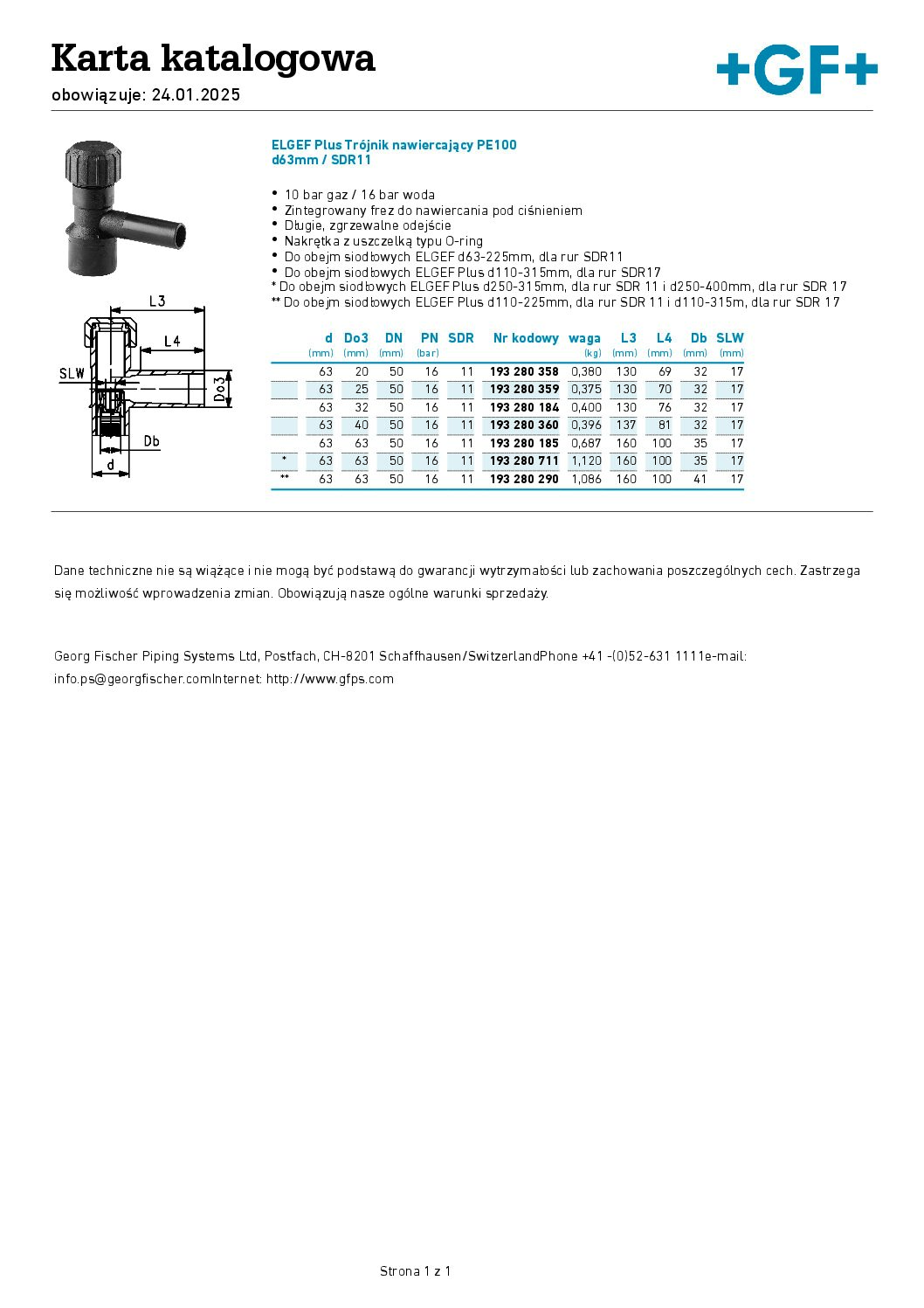 +GF+ Trójnik nawiertka PE100 SDR11 PE63/63PE ELGEF Plus