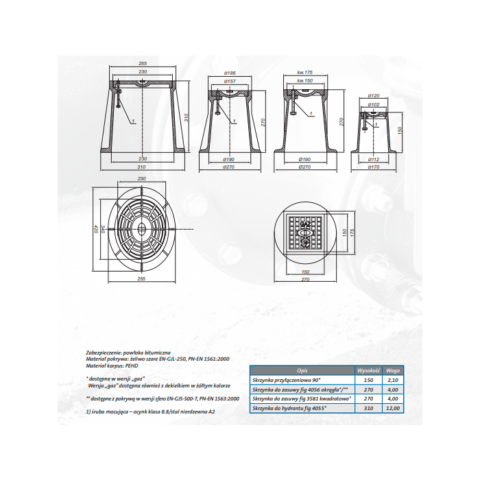 Skrzynka uliczna do gazu umożliwia bezkolizyjne zamknięcie lub otwarcie trzpienia zasuwy, nawiertki lub zaworu znajdującego się pod ziemią. Korpus skrzynki wykonany jest z tworzywa PEHD czyli polietylenu o dużej gęstości , pokrywa wykonana jest z żeliwa przez co ma dużą odporność na czynniki mechaniczne i obciążenie. Pokrywa jest antypoślizgowa, dlatego jest bezpieczna dla osób poruszających się po niej. Skrzynka uliczna dzięki temu cechuje się odpornością na uszkodzenia chemiczne, biologiczne czy mechaniczne .